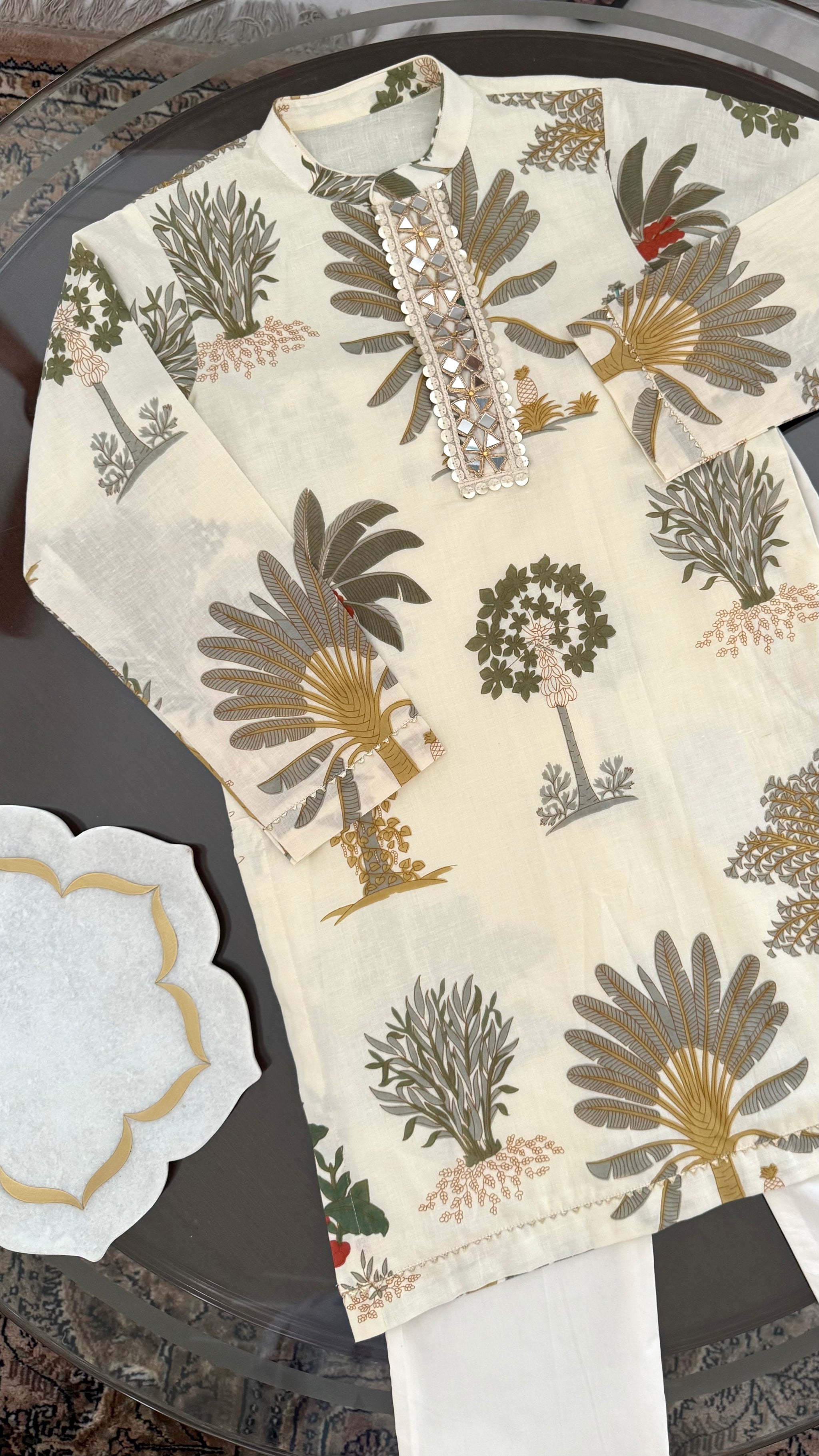 DESCRIPTION : In the most elegant & charming shade, this ensemble in ivory is lovely for the upcoming festivities. Offering supreme comfort in 100% cotton. Kurta has a smart detailed yoke and cuffs with mother of pearl buttons! Pyjama is in ivory.