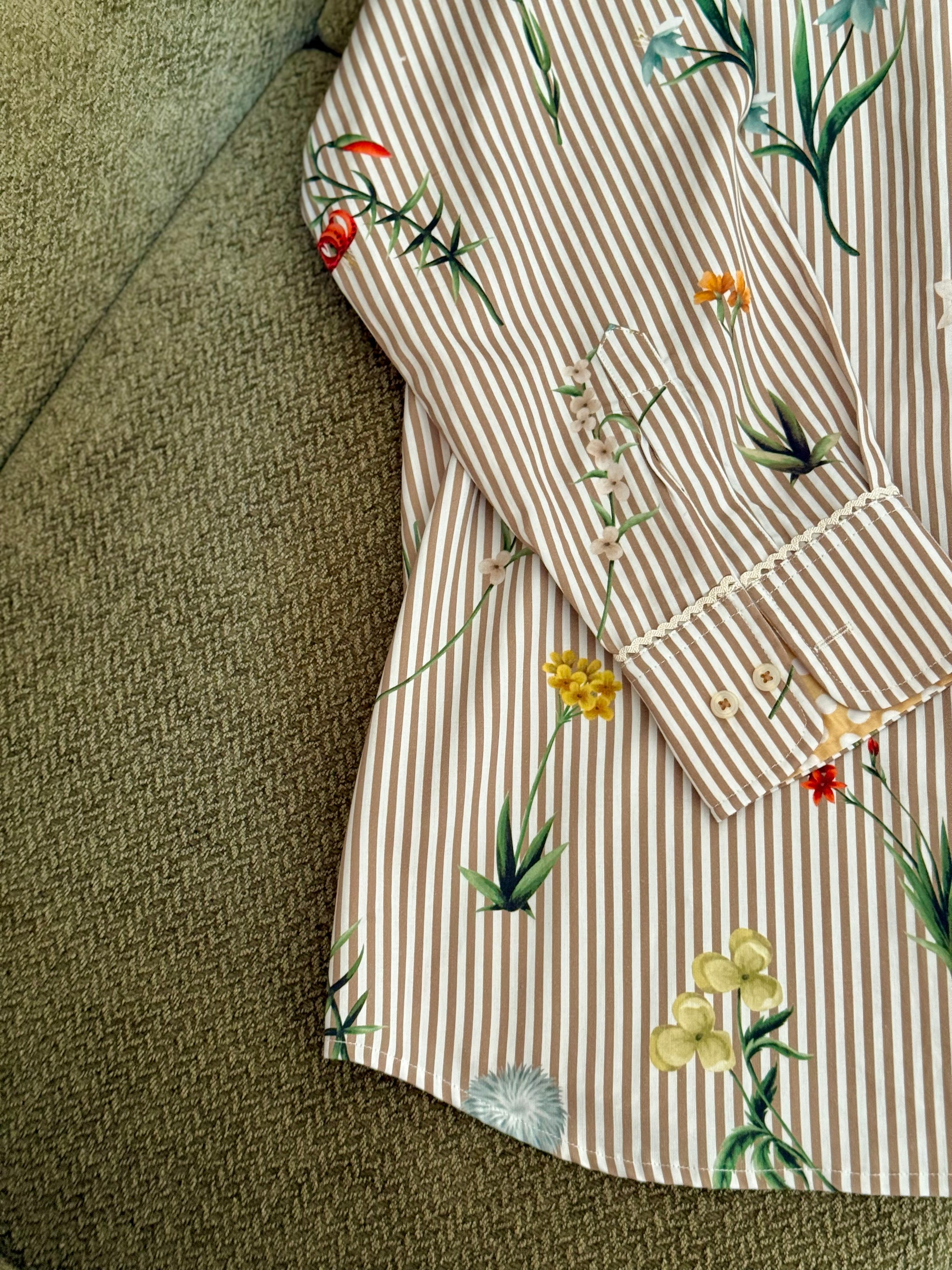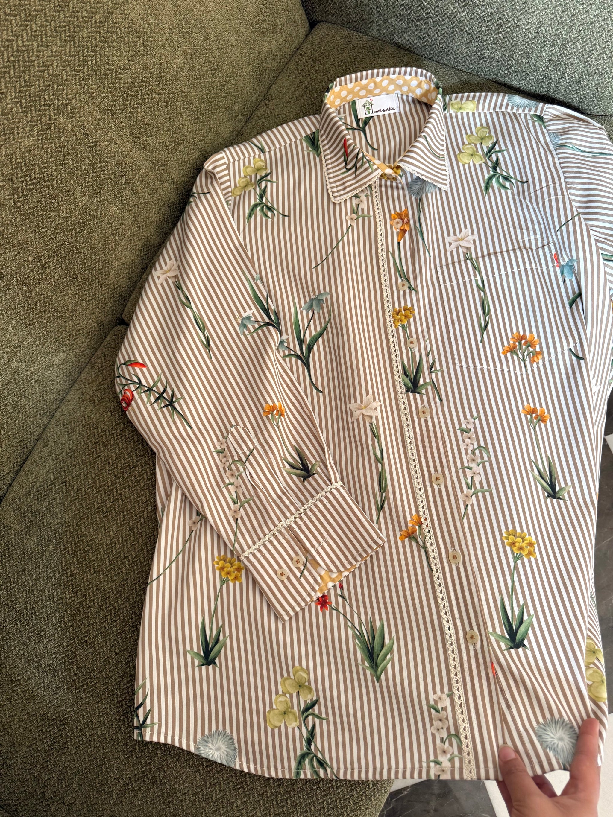 DESCRIPTION : Such a refreshingly chic appliqué shirt that features a flower on the front and a combination of green and blue stripes! This Shirt is easiest to carry off and rush out for your errands without compromising on comfort. The combination of fresh blue and green strips gives it that fresh pop of color!